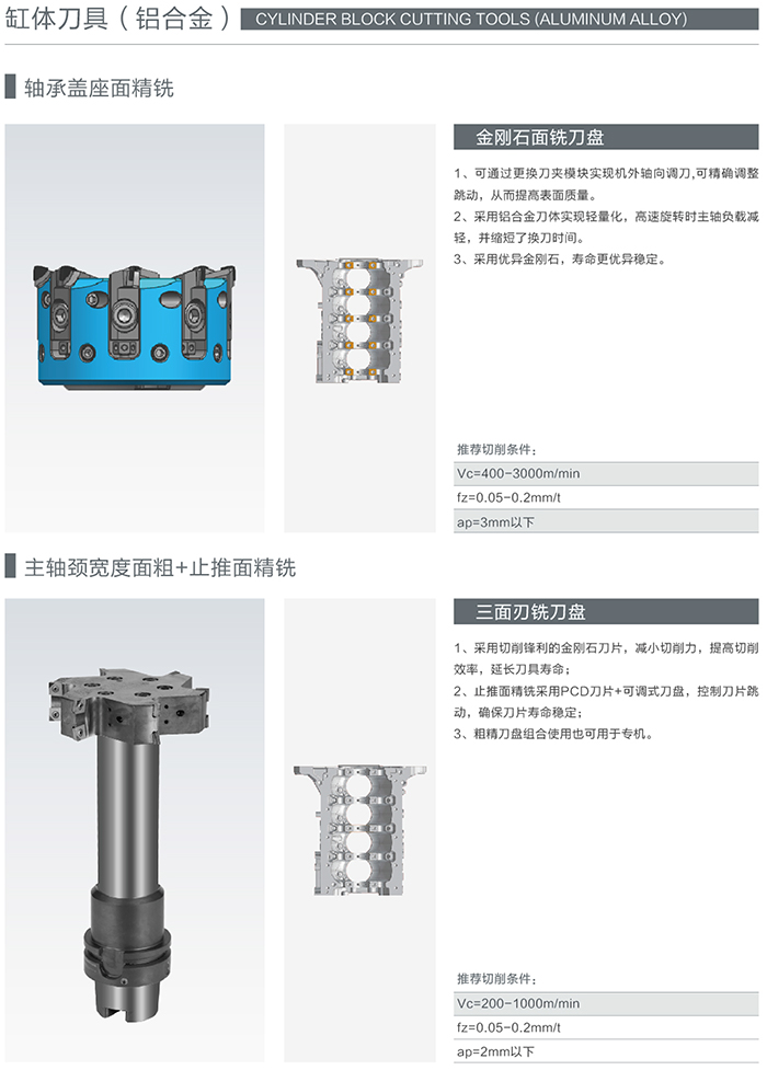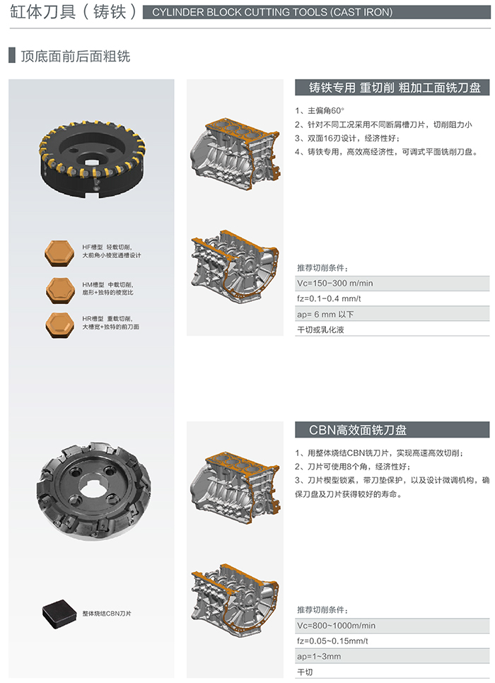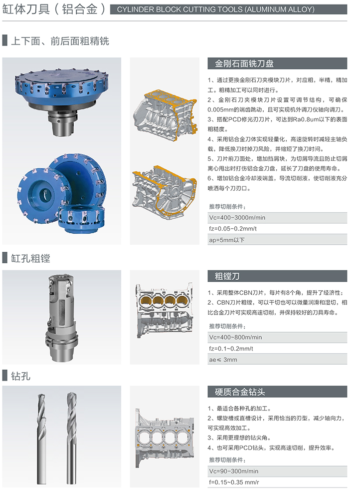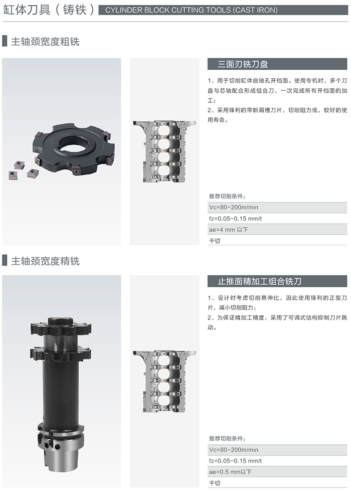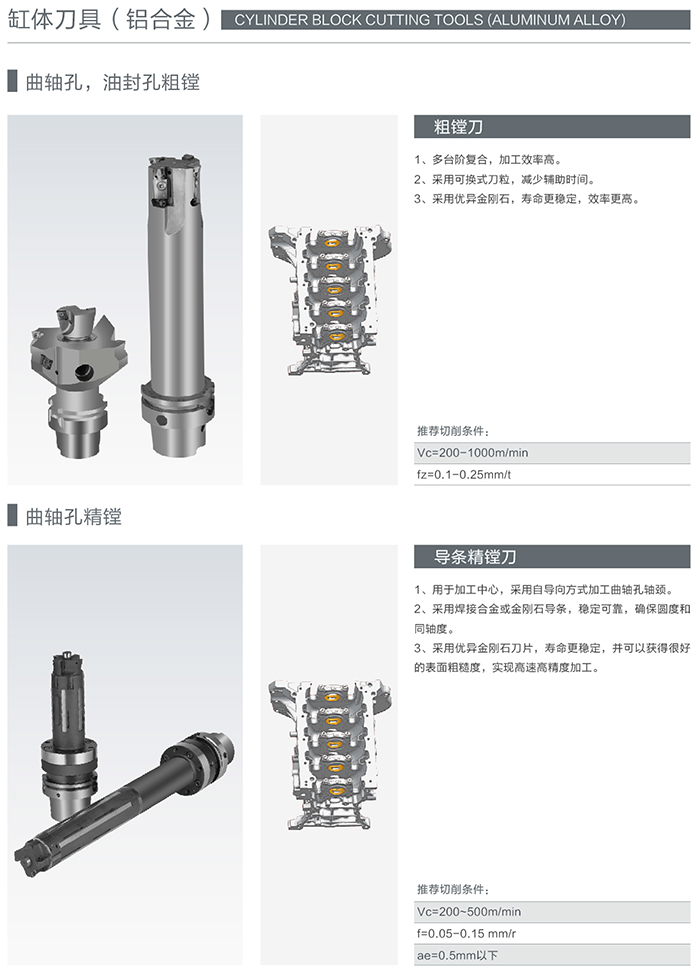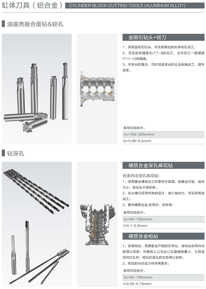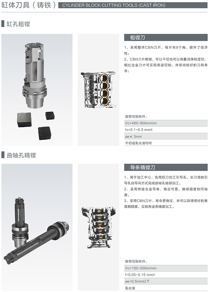 缸體的工作條件決定了缸體必須具有高強度、高剛度、高硬度、高耐磨性以及良好的散熱性,同時要有很好的密封性、防漏性、減振性。這就決定了缸體必須使用最好的精加工刀具才能滿足其機加工工藝要求的極高精度,海洲刀具在這方面積累了大量的實踐經驗。
